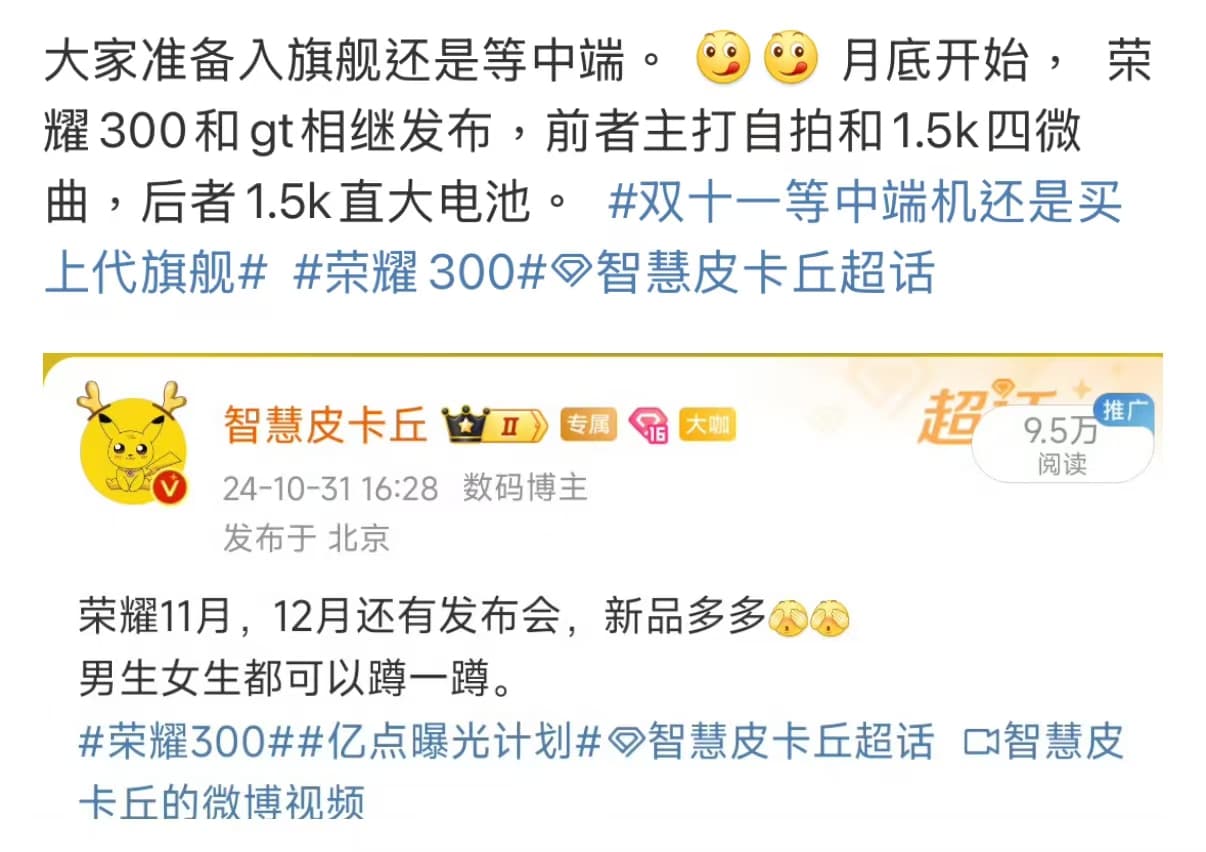 同样走耐用路线的还有荣耀。在荣耀300系列上,标准版和Pro版两款机型都将来到6000毫安时的电池容量,标准版为直面屏、Pro为等深微曲面屏。至于性能配置,还是大家比较熟悉的骁龙7 Gen 3和骁龙8 Gen 3的组合。