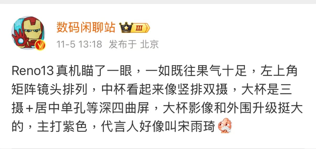 与此同时,博主数码闲聊站也放出猛料,OPPO Reno 13系列定档本月末,延续Find X8的「果味」十足打法,代言人也是新一代女团中非常有人气的中国成员。