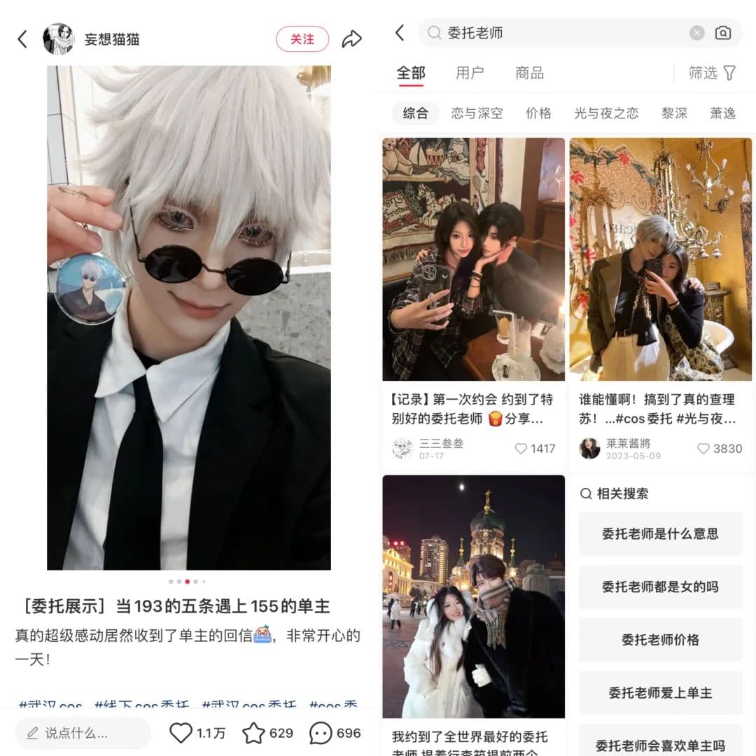 cos委托是cosplay文化的一种延伸服务。双方大多都是女生,其中发起委托的人作为单主,会在类似小红书、闲鱼或微店这样的平台上发布信息,说明她想要扮演的角色和约会的细节,每单报价在日均几十元到几千元不等。接受委托的人即委托老师,会根据“单主”的要求来做相应的准备。