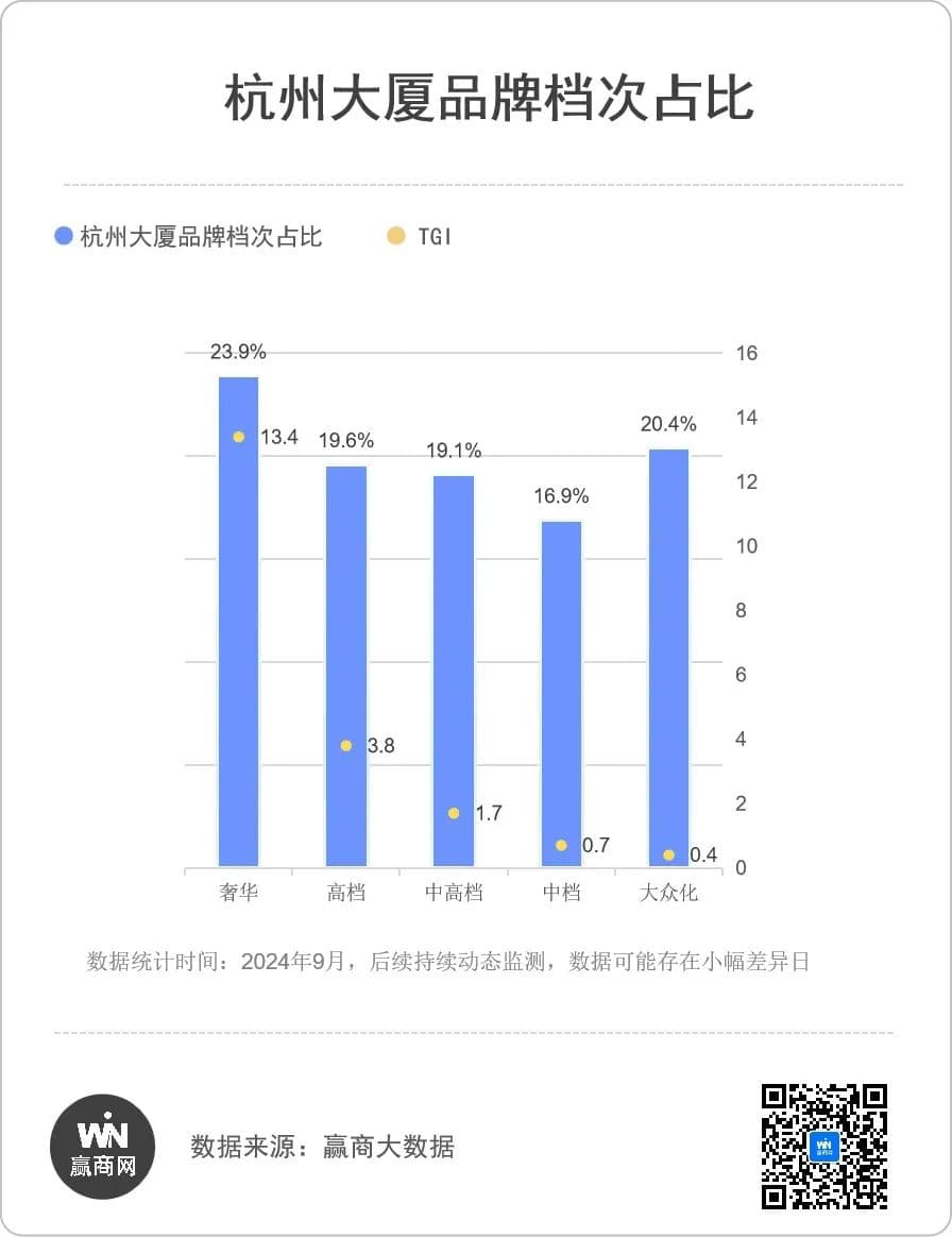 注:TGI指数反映目标样本对比全市平均水平的高低,大于1代表杭州大厦的品牌档次占比高于杭州市平均水平。