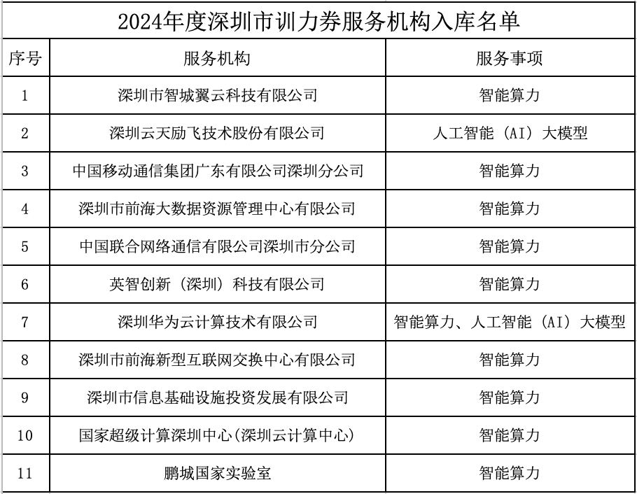 财联社11月13日讯(记者 付静)多地政府为支撑算力产业发展纷纷推行算力券政策,深圳今年则首度提出训力券。财联社记者最新了解到,日前深圳市科技创新局公布2024年训力券服务机构入库名单,三家通信运营商、华为云、云天励飞(688343.SH)、深圳前海新型互联网交换中心在内的11家服务机构入库。