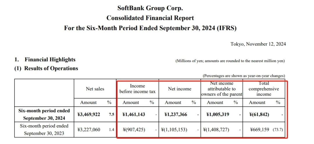 近日,软银集团发布第二财季报告。报告显示,第二财季软银集团税前收入为14611亿日元(折合人民币约681.5亿元),相比2023年同期的-9074亿日元有显著增长。与此同时,归母净利润为10053亿日元(折合人民币约468.9亿元),相比2023年同期的-14087亿日元实现大幅增长,基本每股收益为680.70日元。