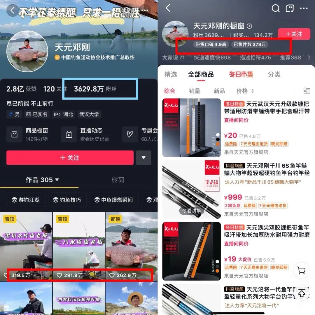 另一方面,钓鱼博主及钓鱼用品带货同样火热。被网友称为“钓鱼界天花板”的天元邓刚在抖音平台收获粉丝3629.8万人,其置顶的黑坑水库盘老板、钓到100多斤的巨青,视频点赞量均在两三百万级。截至目前,天元邓刚的商品橱窗共吸引了134.2万人跟买,商品已售件数已经达到379万件。