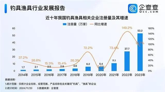 与乐欣户外3年营收逐年下滑形成反差的是,国内钓具渔具相关企业注册量正在逐年增加。