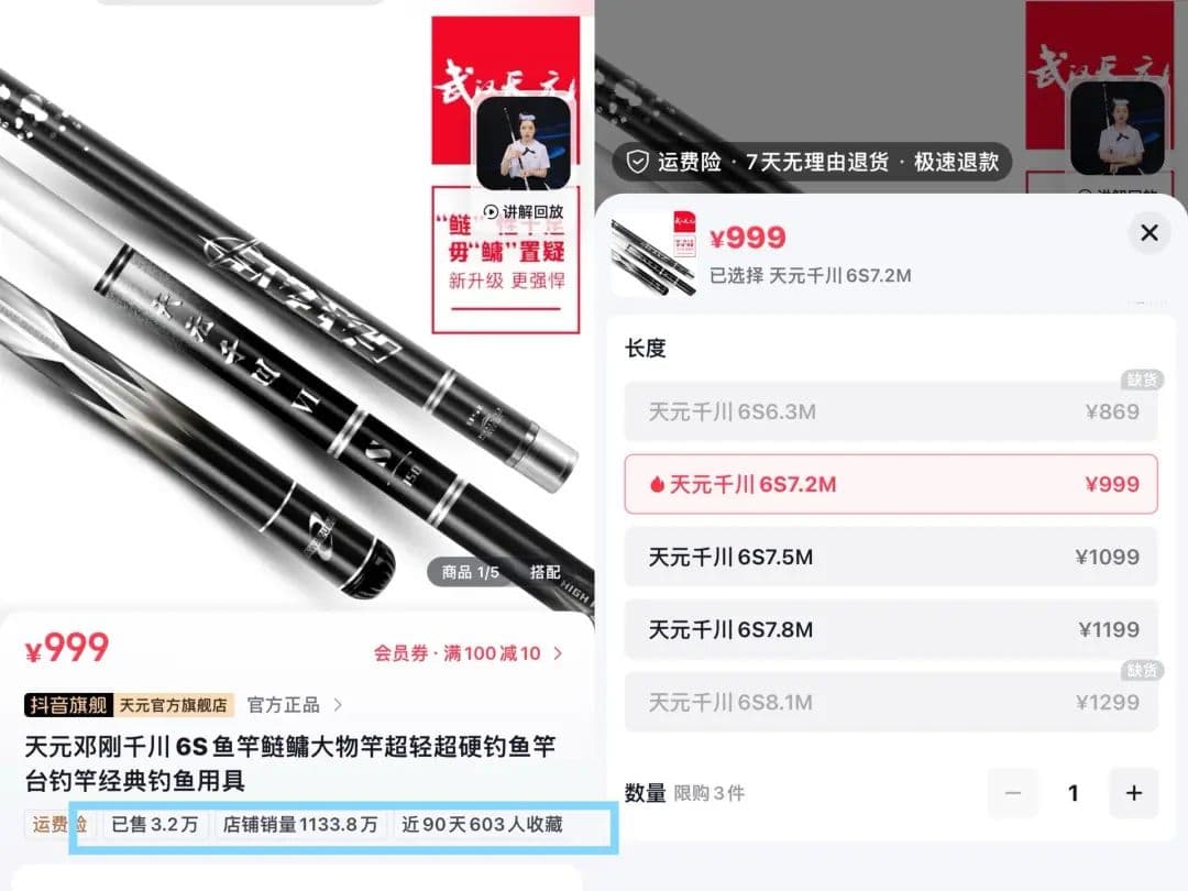 事实上,中国钓鱼市场虽然生产资源比较集中,但消费端过于零散,尚未出现真正的头部品牌。而消费者对于好品牌的诉求其实一直存在,在天元邓刚的抖音橱窗中可以窥知一二。虽然仅为个人IP,其自营品牌“武汉天元”一根售价在869-1299元不等的钓鱼竿,销量已超过3.2万。