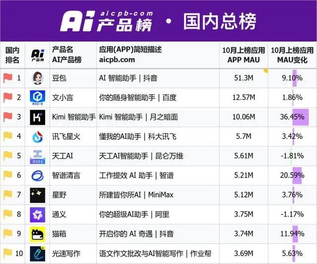 由“AI产品榜(aicpb.com)”发布统计显示,通义应用在今年10月份的“AI产品榜·国内总榜”中仅位列第八,月活跃用户为375万,而字节跳动旗下的AI产品豆包位居第一,月活跃用户超过5130万;百度旗下的文小言位居第二,月活跃用户为1257万。对比下来,通义的用户数比头部应用要低一个数量级,甚至比AI初创公司的Kimi和智谱清言都还要低不少。