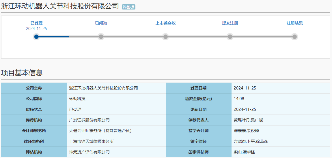 上交所网站显示,浙江环动机器人关节科技股份有限公司科创板IPO获得正式受理,拟募资14.08亿元。该公司主营产品为RV减速器,广泛应用于机器人、工业自动化等高端制造领域。