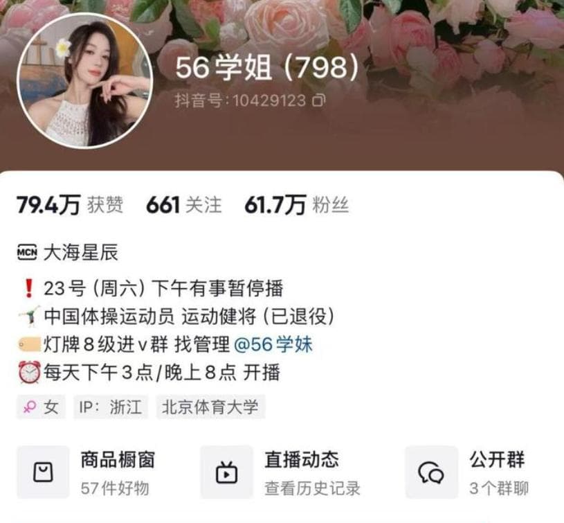 其实早从今年4月开始,吴柳芳就以“56学姐”的抖音达人身份复出,在视频被删之前,该账号已发布50多条热舞视频,第三方数据显示,56学姐年内已开了超400场直播,近月以来几乎全勤。