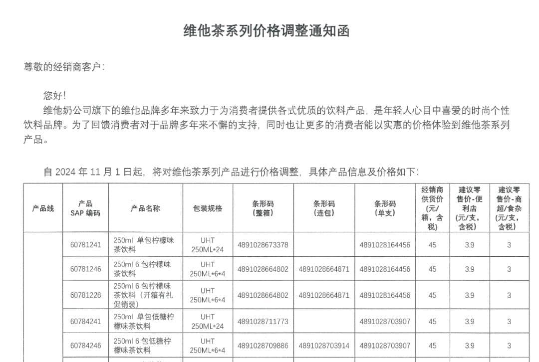 例如,内参君曾独家报道,维他奶于11月初宣布旗下维他茶系列的价格调整,下调250ml单包茶、500mlPET以及310ml礼盒装多种规格的经销商供货价,每件下调幅度约为2港元。业内人士分析,这一调整不仅与白糖价格下降有关,也与维他奶长期存在的渠道价格倒挂问题有关。