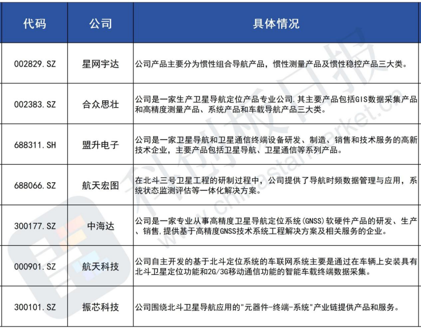 该券商认为,随着北斗系统应用场景进一步拓宽,北斗时空信息服务市场的需求将继续增长。从投资层面来看,建议关注北斗导航产业。据《科创板日报》不完全统计,以下A股公司在北斗导航应用方面有布局: