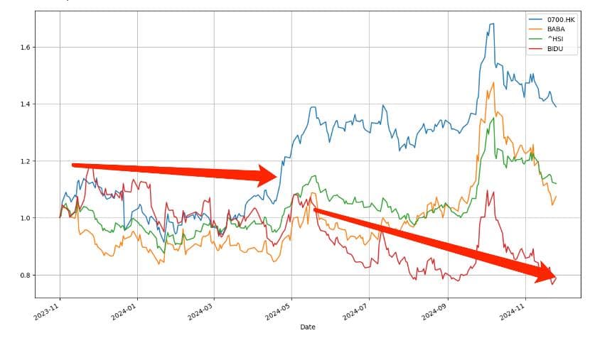 以2024年4月为分界线,在此之前三家股价波动大致在同一区间(围绕在恒生指数上下),其后便呈现了明显分化:腾讯遥遥领先,阿里与大盘恒生指数同频互动,与此同时百度则越发沉寂,9月下旬虽乘宏观政策东风有一轮明显上扬,但不久便疲态尽显。