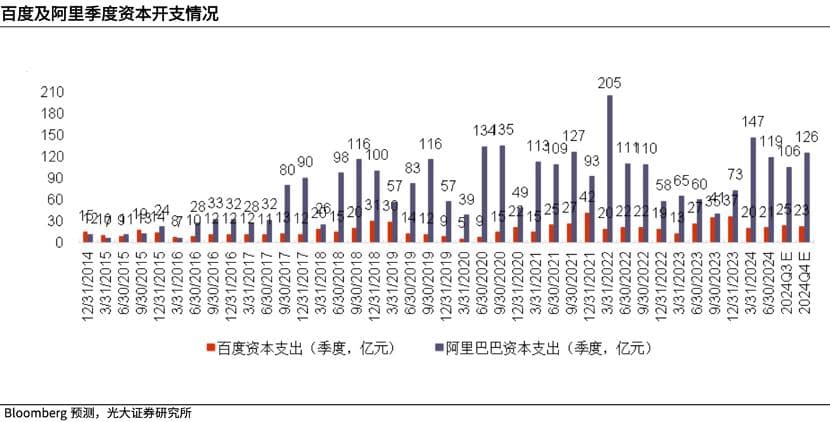 微软,谷歌,META等海外云计算厂商已经明显加大了资本开支,阿里的资本开支在近几个季度也有明显反弹,相比之下百度的表现又要审慎许多,2024年Q3百度核心(剔除爱奇艺)资本开支为16.4亿元,同环比都有明显下降趋势(2023年Q3该数字为35.3亿元,2024年Q2则为21亿元)。