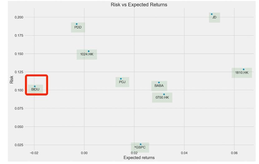 我们整理测算了代表互联网企业过去一年的表现情况,用股价波动标准差视为”风险”,每日平均波动视为“预期收益”,可以非常直观看到过去一年百度在资本市场整体表现为“低回报,高风险”。