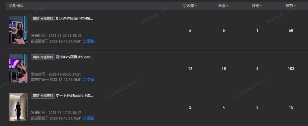 据新榜旗下抖音数据工具新抖统计,吴柳芳最早的抖音热舞视频发布于2023年11月。但直到2024年6月,吴柳芳的视频点赞数都很少破千。
