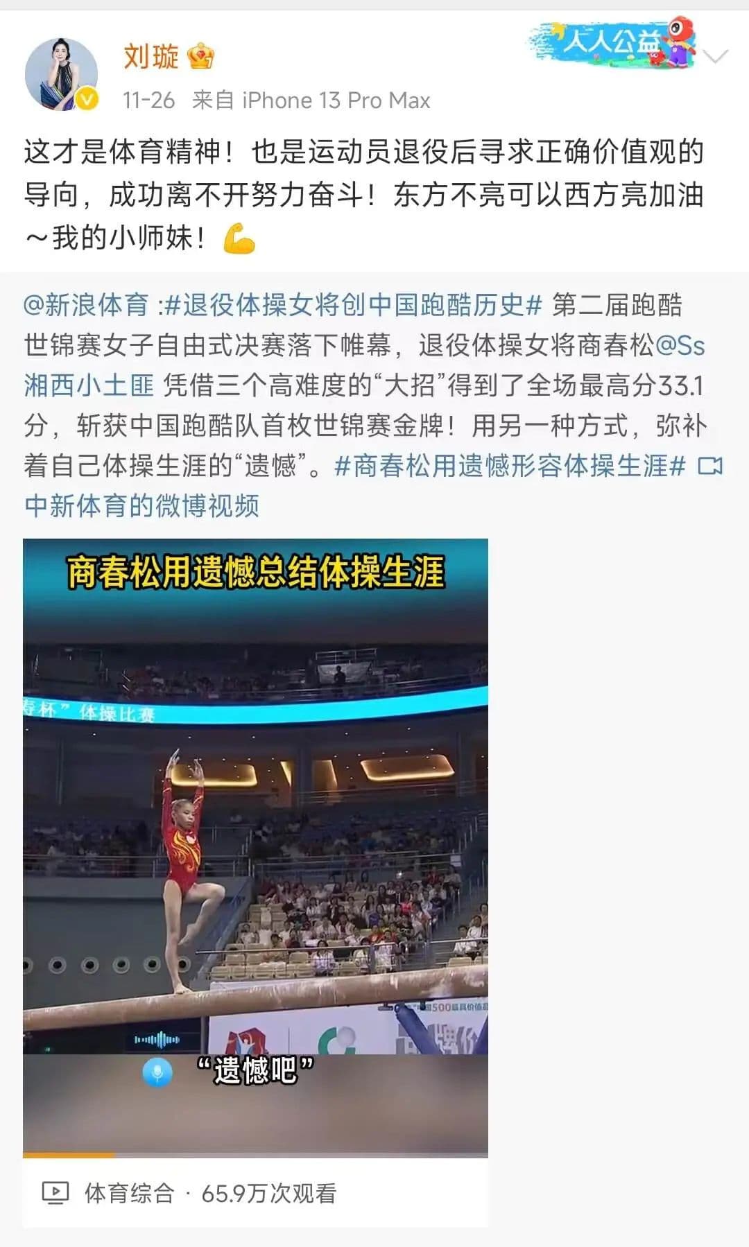 11月26日,体操奥运冠军刘璇转发“退役体操女将创中国跑酷历史”的新闻,并留言“这才是体育精神!也是运动员退役后寻求正确价值观的导向”。