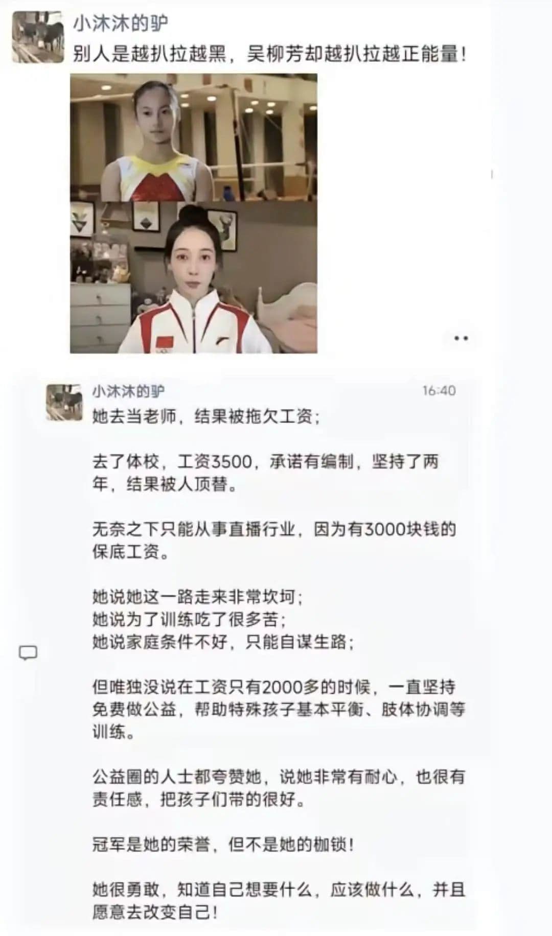另一方面,“1米54的身高,24岁只身出来打拼,做老师被拖欠工资,做教练不能入编,只能搞直播糊口”,这样的故事让吴柳芳成为网友眼中努力奋斗的励志女孩,对她的批评则被网友视为何不食肉糜,是既得利益者的双标。在最新的媒体报道中,热心公益成为吴柳芳身上最大的标签之一。
