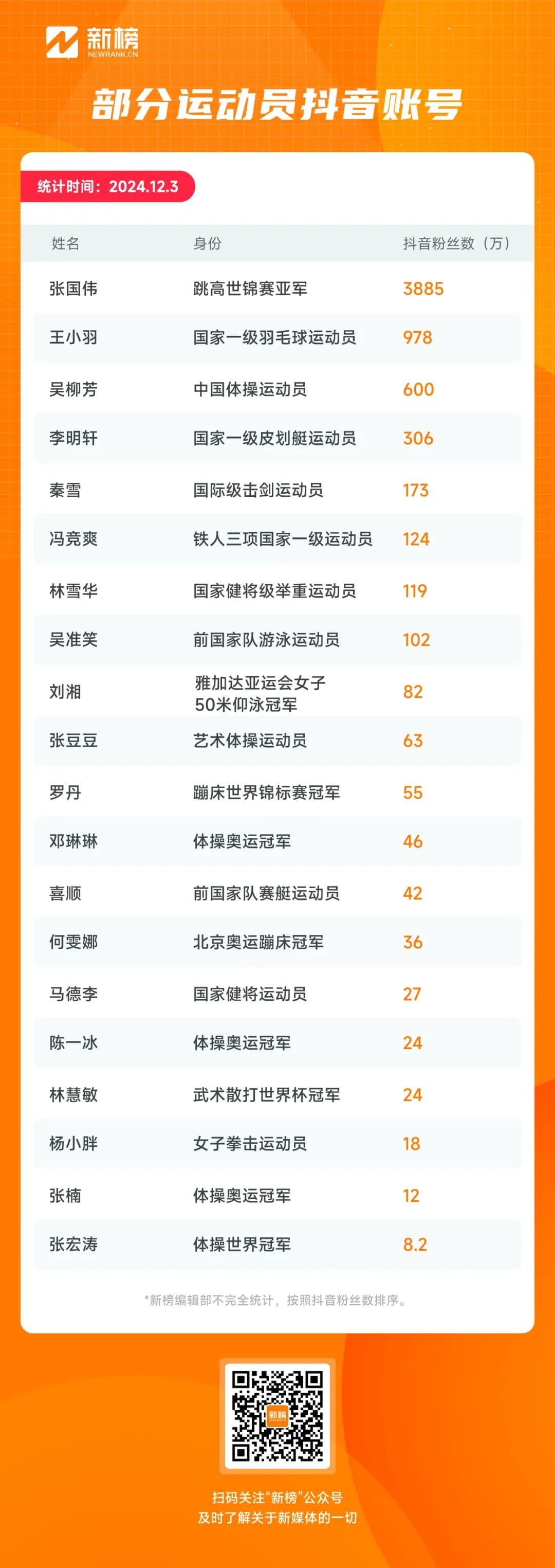 借助新抖数据,新榜编辑部不完全整理了20个没有上述条件的运动员抖音账号做参考。