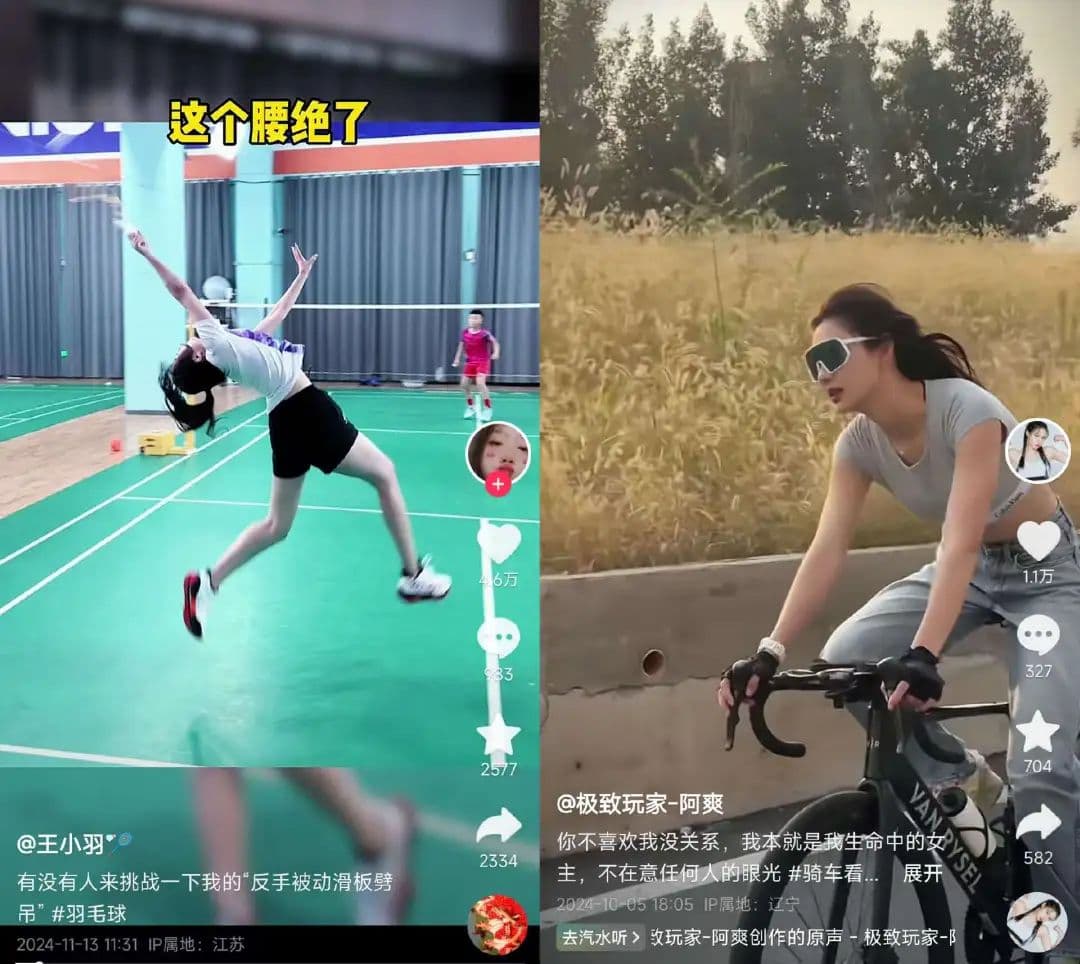 一类是围绕特定运动项目展开视频创作,展示有趣健康的生活,比如游泳运动员王小羽和铁人三项运动员冯竞爽,他们的做法是将运动项目进行大众化、娱乐化改造,尽可能扩大视频的受众范围。