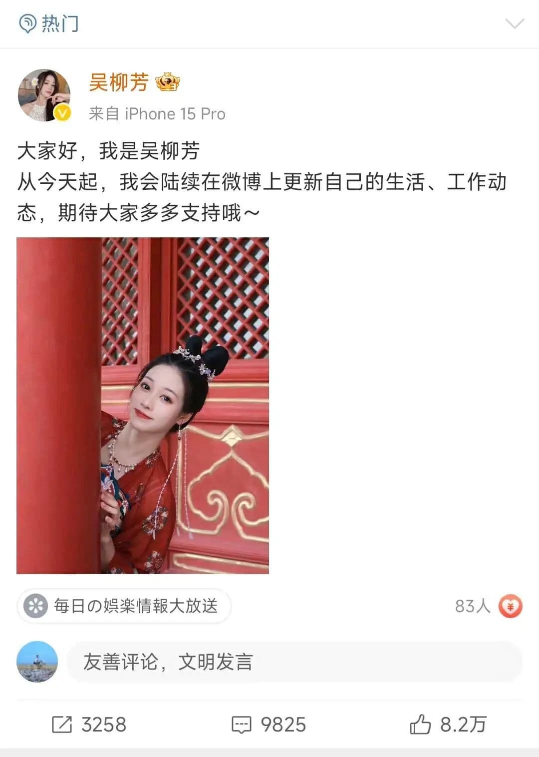 12月2日晚,吴柳芳开通个人微博并发文:“大家好,我是吴柳芳。”截至发稿前,该账号粉丝数达10万,恰如“擦边风波”前她的抖音账号。