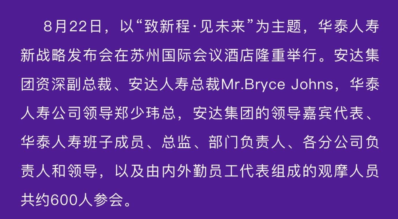 值得注意的是,华泰人寿官网上发布的关于新战略发布会的内容显示,参会人员有安达集团资深副总裁、安达人寿总裁Mr.Bryce Johns,华泰人寿领导郑少玮,安达集团的领导嘉宾代表华泰人寿班子成员、总监、部门负责人、各分公司负责人和领导,以及由内外勤员工代表组成的观摩人员等共约600人。