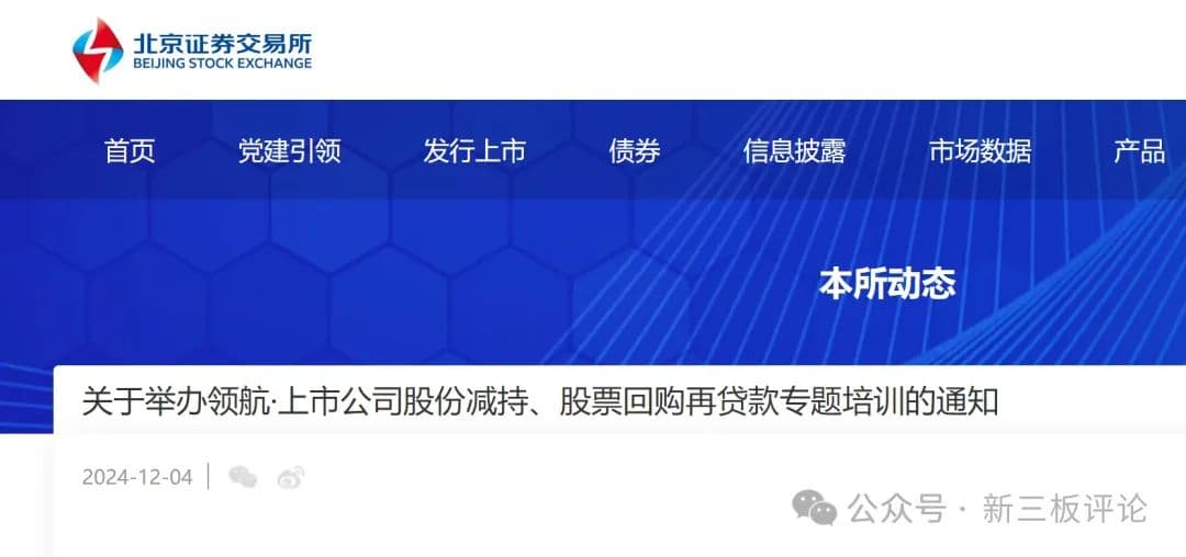 同时,新三板评论发现北交所公告将于12月10日举办股票回购再贷款专题培训,推动上市公司积极运用回购、增持等工具进行市值管理。