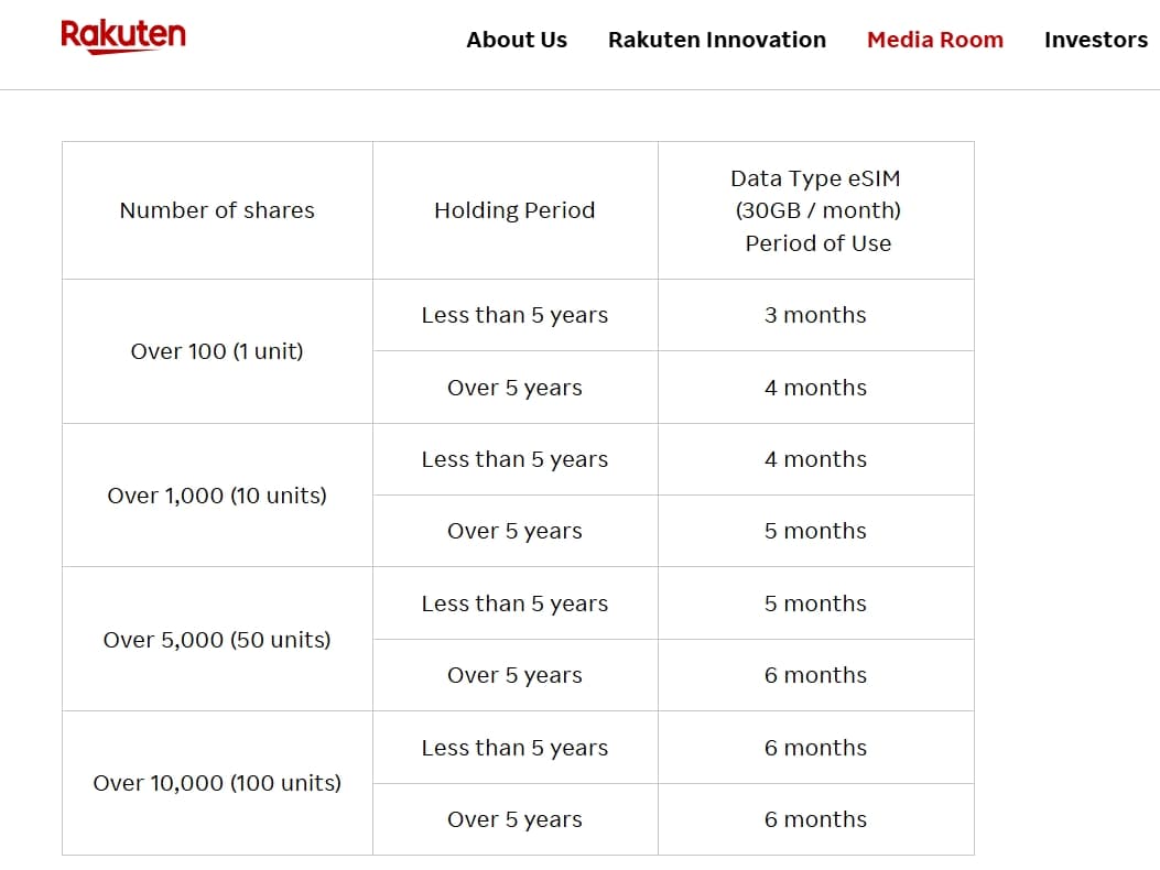 乐天去年首度推出这项计划,其中持有100股的投资者最多只能获赠4个月的免费通话/流量套餐。而且股东们最多只能获赠6个月的免费套餐,如果要继续使用还得自己掏钱。