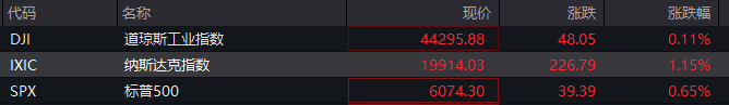金融市场方面,数据发布时美股还未开盘,但三大股指期货均出现短线拉升。随后,美股三大指数均高开,纳指和标普500指数持续扩大涨幅。截至发稿,道指涨0.11%,纳指涨1.15%,标普500指数涨0.65%。