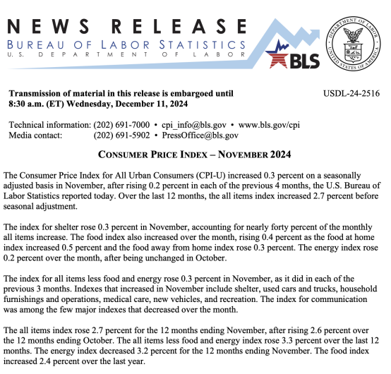 当地时间12月11日,美国劳工统计局发布的数据显示,11月CPI同比上涨2.7%,与市场预期一致,略高于10月的2.6%。环比方面,11月CPI上涨0.3%,同样符合市场预期。剔除波动较大的食品和能源价格后,核心CPI同比上涨3.3%,环比上涨0.3%,均与10月持平。