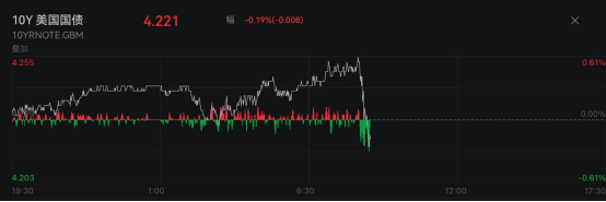 黄金、白银并无明显波动。美元指数则短线跳水,截至发稿,报106.35,抹去日内所有涨幅。美国国债收益率震荡走低,10年期国债收益率报4.221%;对利率路径更为敏感的2年期国债收益率的回落尤为明显,报4.126%。