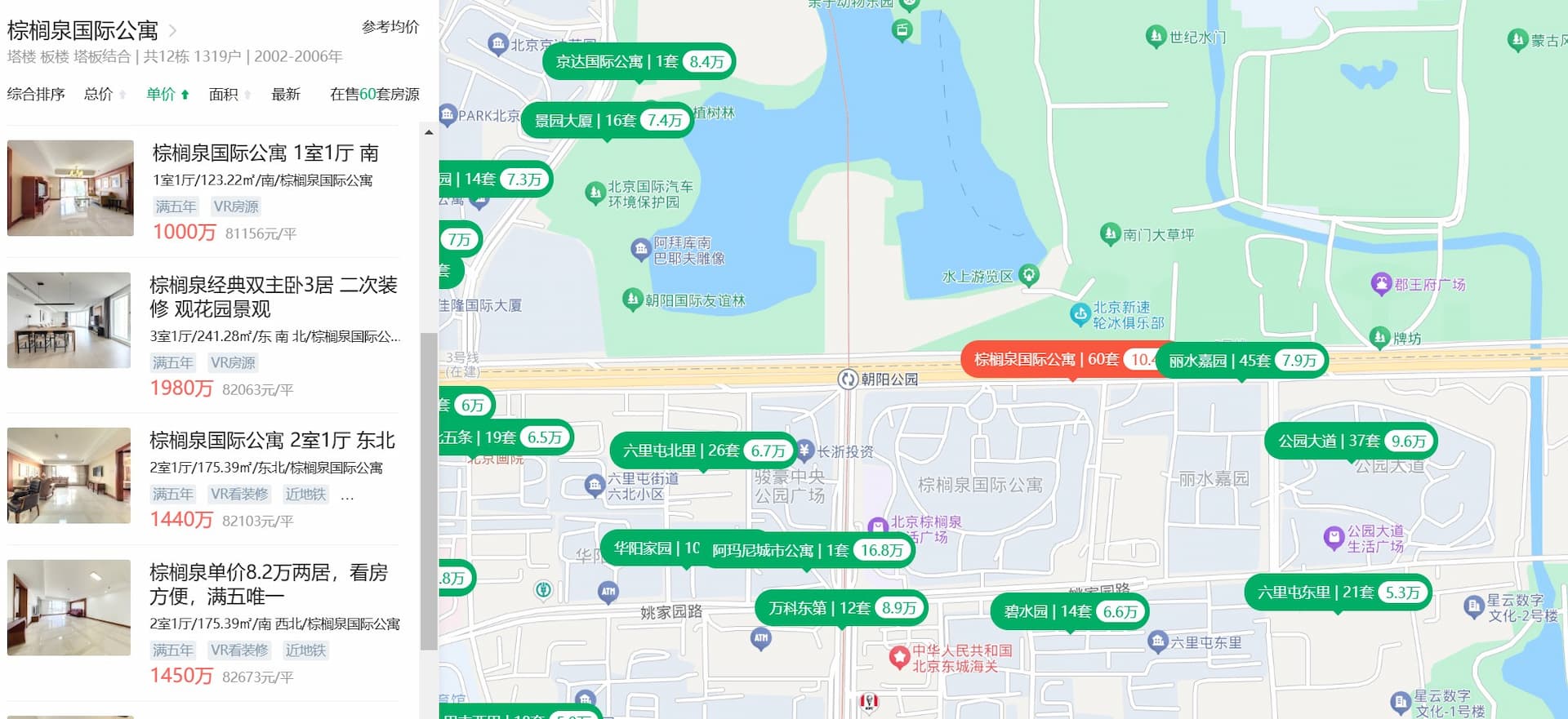 朝阳公园旁,2002年建设的棕榈泉国际公寓挂牌均在10.4万元/平米,低楼层的最低价格也在8万元/平米以上。高端次新北京壹号院的挂牌均价更是在20万元/平米以上。整体开发稍晚的朝阳公园东边板块,更是成了一个豪宅扎堆的高端居住区。