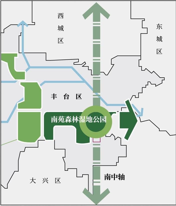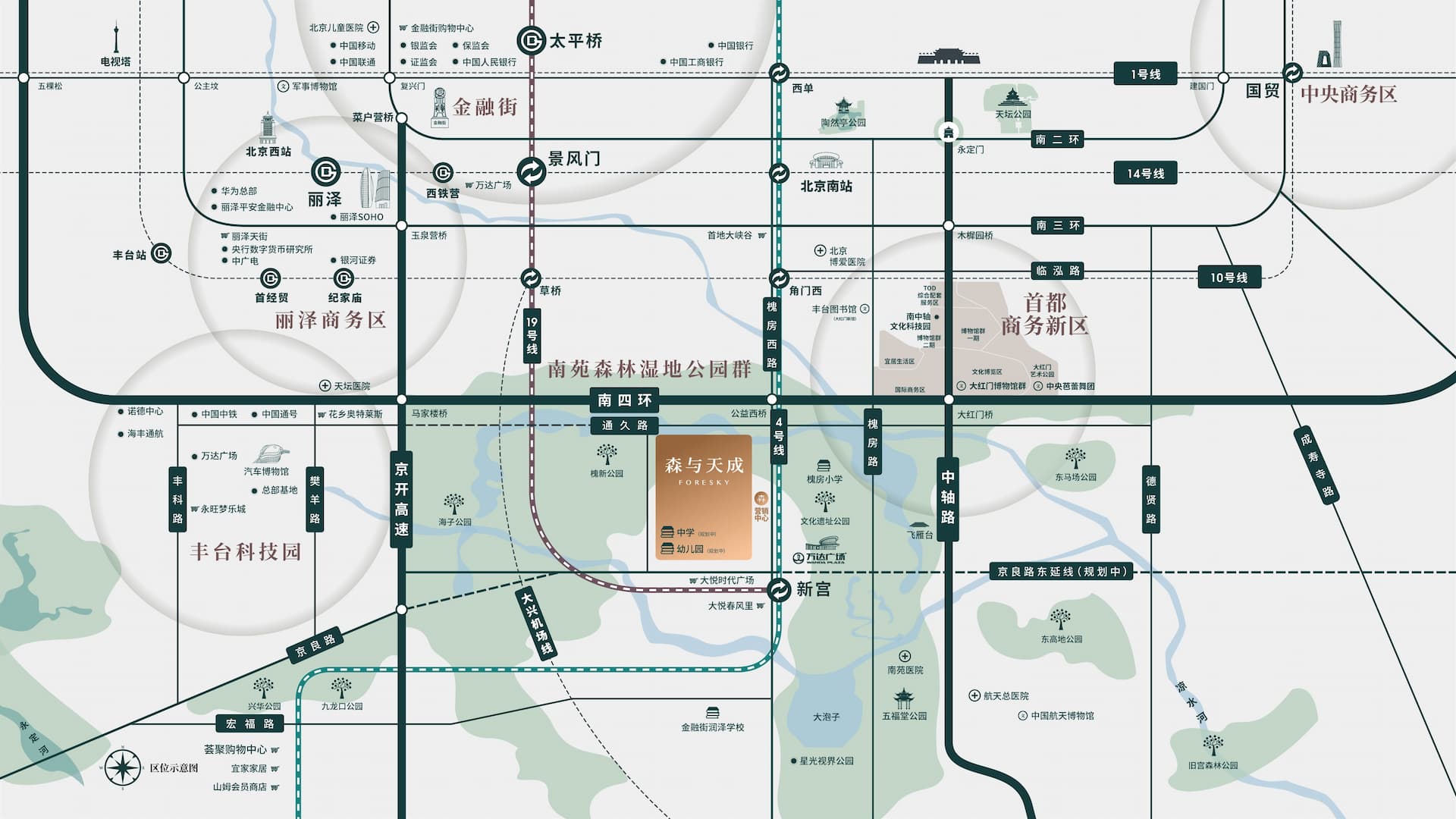 南苑森林湿地公园和丰台南苑板块及南中轴板块原有的槐新公园、海子公园形成了一个半环抱形状,而森与天成正好在公园的“怀抱”中。