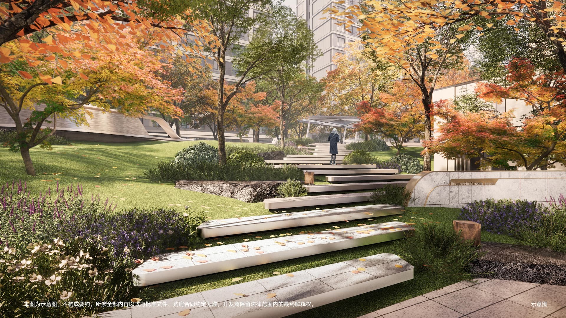 虽然外部城市公园已经提供了足够的高含氧量和休闲绿地,但为了不浪费项目1.04的综合容积率,森与天成将绿地当作社区与城市的连接与呼应,在这个大公园围合区中又做出了一片层层递进的三层社区园林。