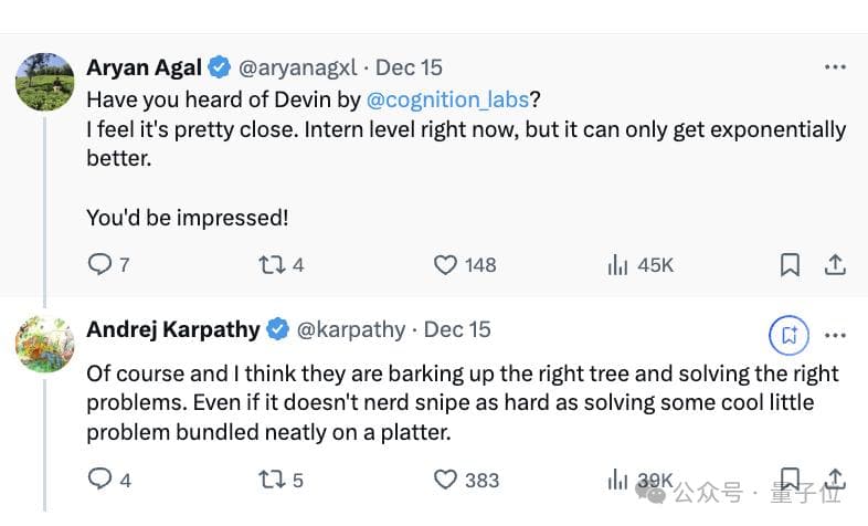 而在Karpathy「最看好AI能力是初级实习生,而非解决博士级问题」的观点之下,有人提及了Devin是否已经接近这一水平。