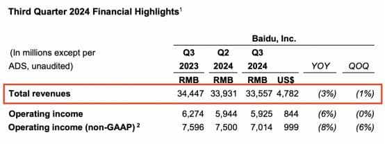 财报显示,百度2024年第三季度营收为335.57亿元,去年同期为344.47亿元;核心营收为265.24亿元,去年同期为265.72亿元;归属百度核心的净利润为75.36亿元,去年同期为64.36亿元。