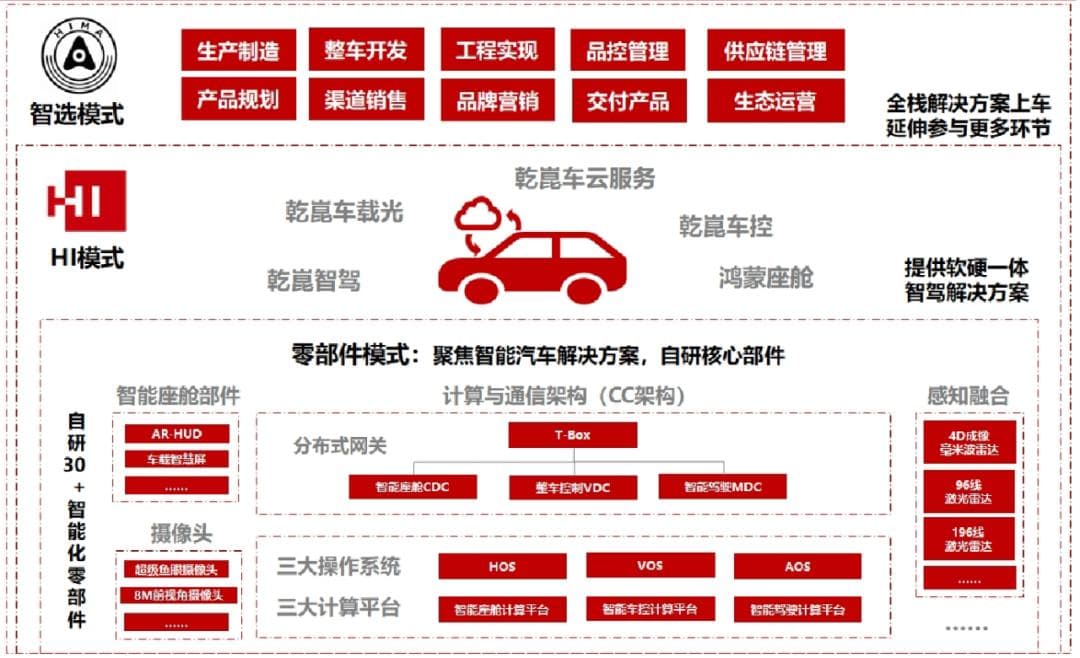 其中,“乾崑”解决方案品牌以乾崑智驾为核心,还包括乾崑车控、乾崑车载光和乾崑车云;“鸿蒙座舱”主要包括鸿蒙车机、车载智慧屏等智能座舱相关零部件产品。