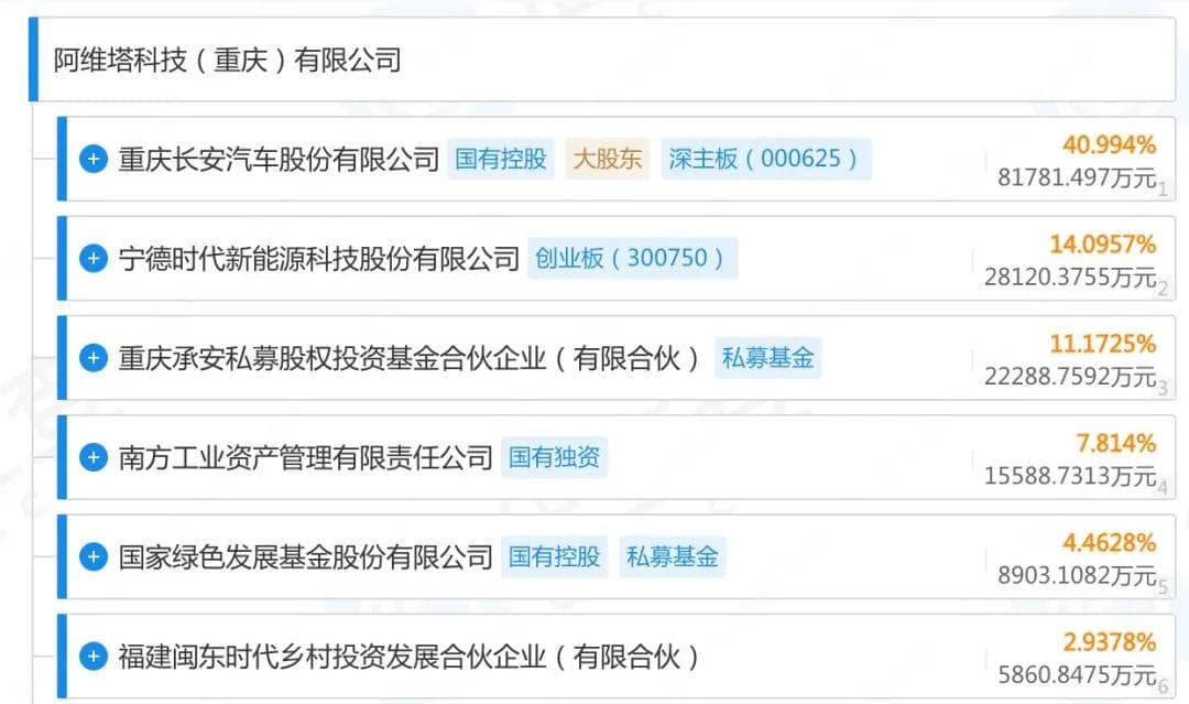 阿维塔股权占比情况(部分)。资料来源:企查查