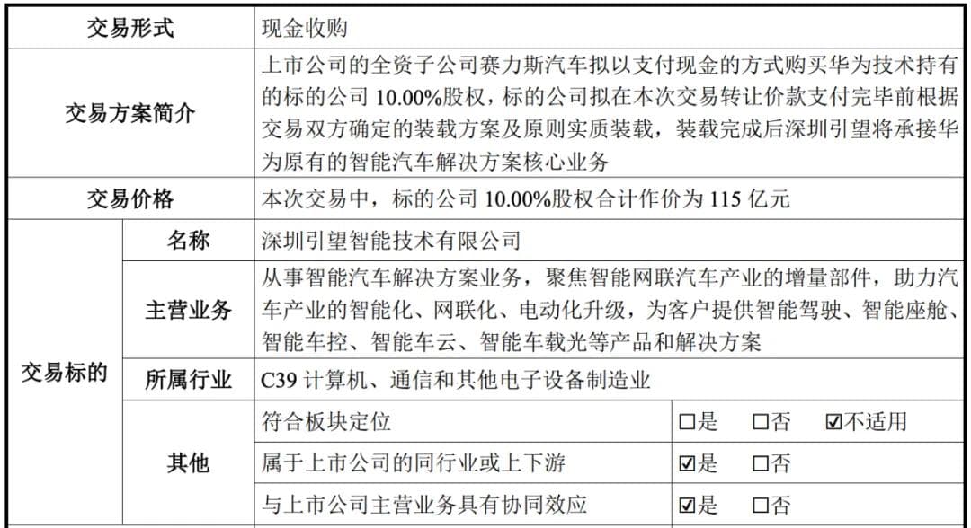 很快,8月25日,赛力斯也宣布将以支付现金的方式购买引望10%股权,交易金额为人民币115亿元。