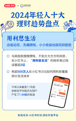 财联社12月19日讯(记者 沈述红)近日,小红书联合蚂蚁财富平台发布《2024年轻人十大理财趋势盘点》,“用利息生活”、“只求微赚”和“股市迎新”成为年度理财现象。