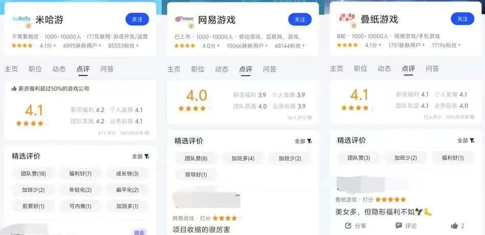 与此同时,在点评板块我们也能看到从业者对米哈游的整体评价。例如,其工资福利超过50%的游戏公司,公司综合点评分为4.1,“团队赞”、“福利好”、“年轻化”、“扁平化”、“加班多”等是从业者对其的印象标签。