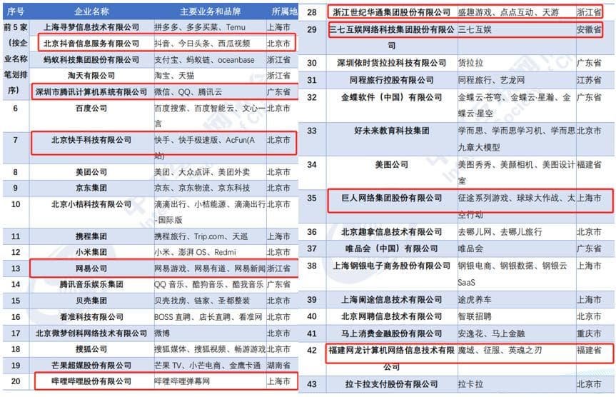 2024年中国互联网综合实力前百家企业中的游戏厂商,包括腾讯(Top5,前五名按企业名称笔画排序)、网易(Top13)、B站(Top20)、世纪华通(Top28)、三七互娱(Top29)、巨人网络(Top35)、网龙(Top42)、恺英网络(Top45)、四三九九(Top46)、吉比特(Top53)、竞技世界(Top55)、途游(Top77)、中旭未来(Top83)、创梦天地(Top93)、诗悦网络(Top99)等。