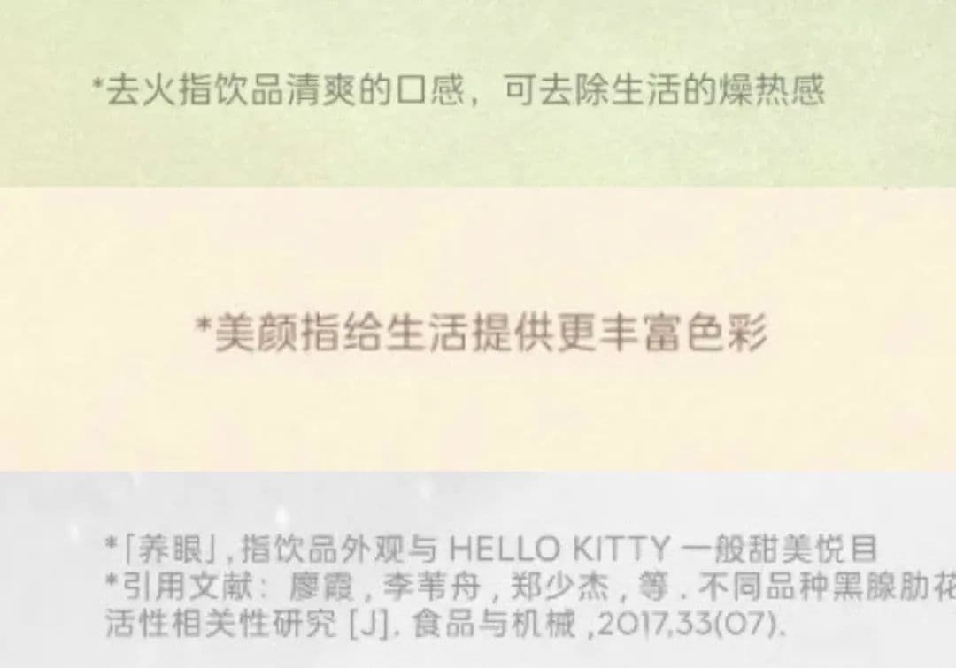 喜茶在这方面做的比较严谨。在去火*瓶、美颜*瓶、养眼*瓶等产品的外贴标签上做出解释: