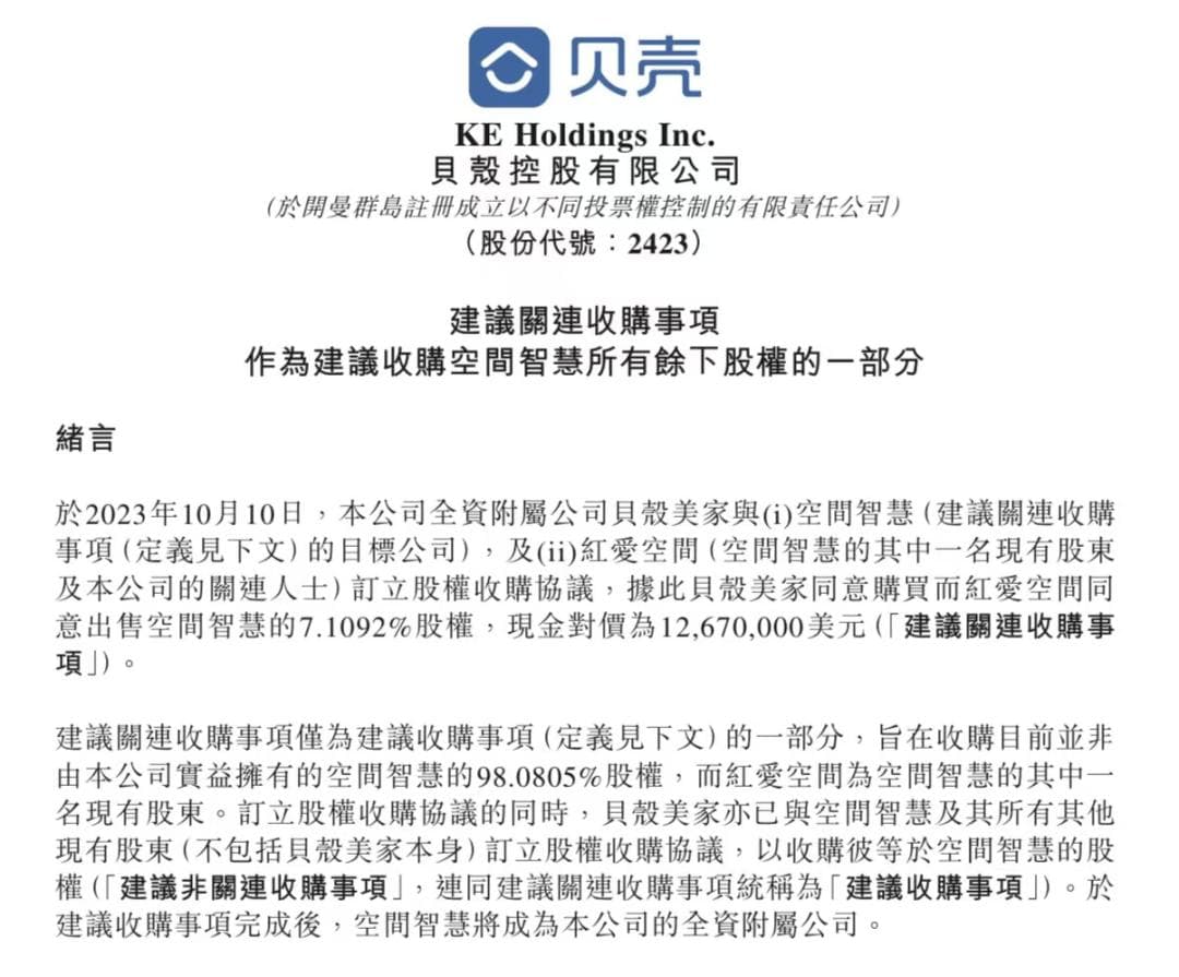 另外,7.1092%由红爱空间持有,因而公告内容主要指向贝壳美家与空间智慧(目标公司)及红爱空间(卖方公司)定立股权收购协议。双方就该部分股权协定的对价交易金额为1.267亿美元,收购完成后,空间智慧将为贝壳全资子公司。
