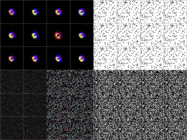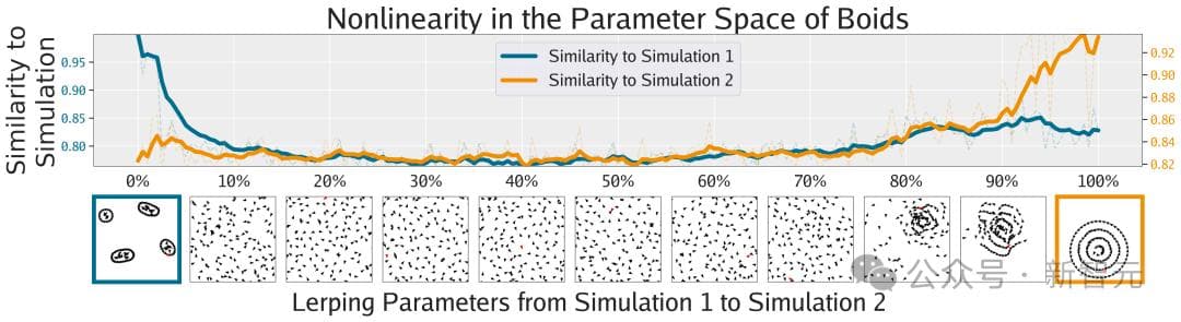 在下图中,研究人员对两个Boids模拟之间的参数进行线性插值。中间的模拟缺乏任何一个原始模拟的特性,表现为无序状态,这清楚地表明Boids参数空间具有非线性和混沌特性。