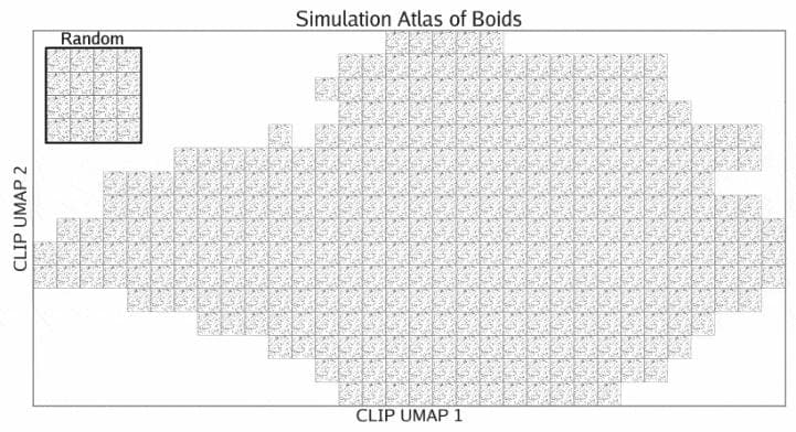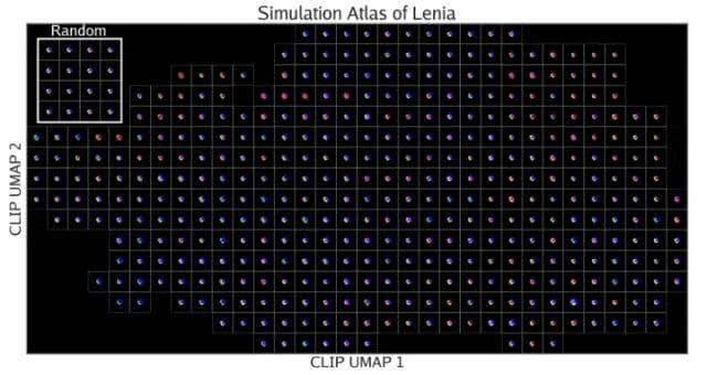 这些模拟的最终状态,会通过CLIP嵌入并使用UMAP投影到二维空间中。然后对该空间进行网格采样,并展示每个网格内最近的模拟。