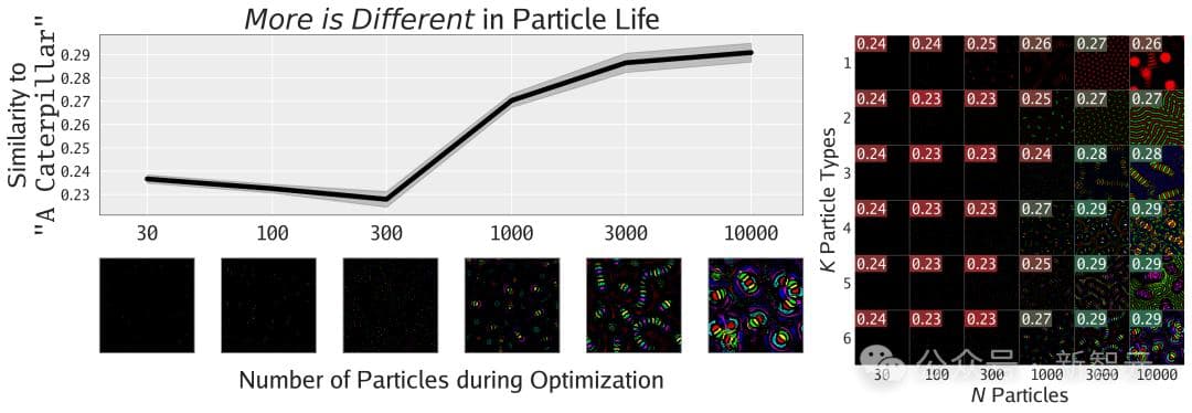下图评估了粒子生命(Particle Life)中粒子数量对其表现特定生命形式能力的影响。