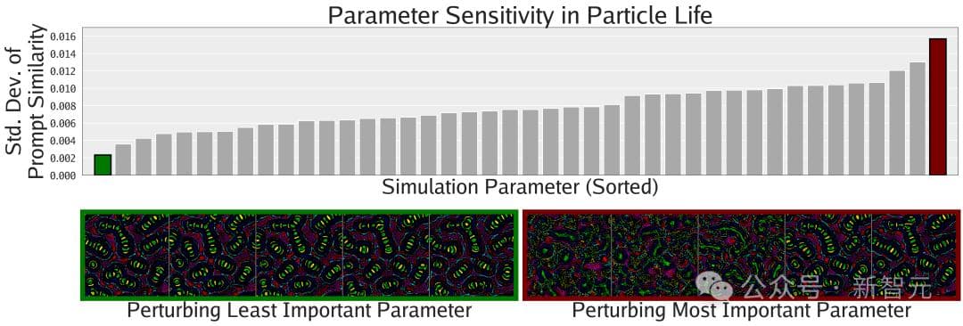 接下来的图表通过逐一调整粒子生命模拟的各个参数,并测量CLIP提示词对齐评分的标准差,来量化每个参数对模拟行为的重要性。