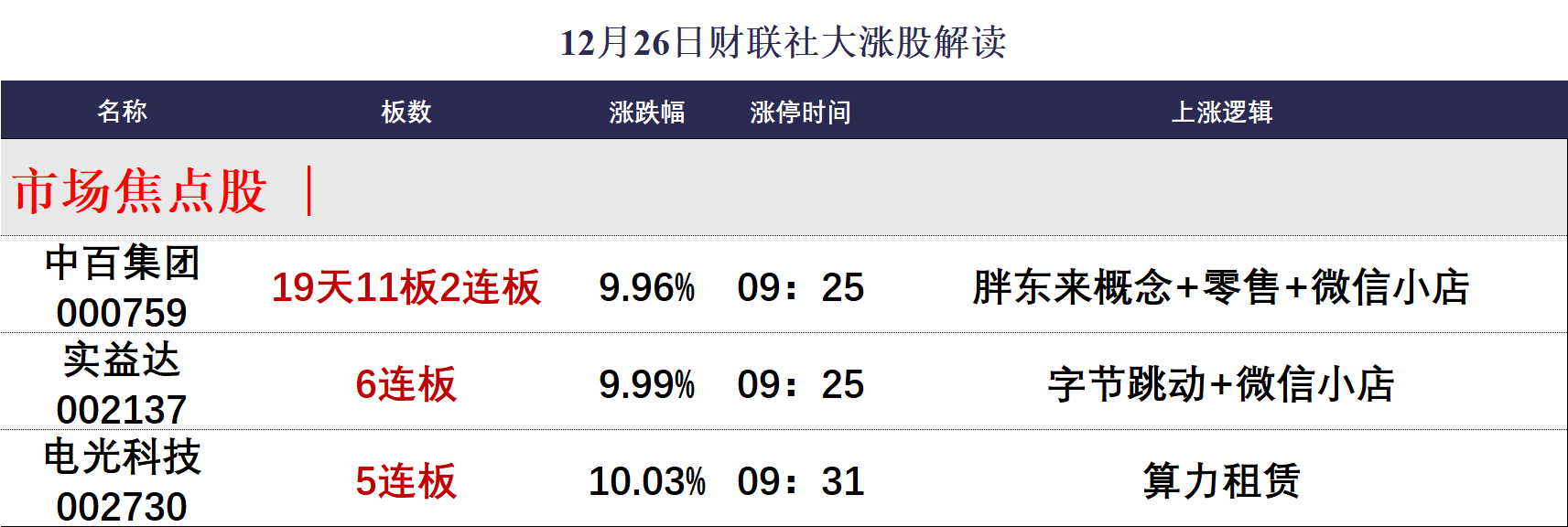 财联社12月26日讯,今日96股涨停,24股炸板,封板率为80%,实益达6连板,电光科技5连板,景兴纸业、吉华集团、福龙马3连板,中百集团19天11板,潍柴重机5天4板,麦格米特、露笑科技9天4板,瑞芯微、宝胜股份、华脉科技、得润电子6天3板。沪深两市全天成交额1.27万亿,较上个交易日缩量88亿,成交额续创阶段新低。盘面上,题材板块相对活跃,中小盘股普涨,全市场超3600只个股上涨,逾百股涨停或涨超10%。板块方面,铜缆高速连接、CPO、液冷服务器、AI眼镜等板块涨幅居前,西藏、电力、银行、港口等板块跌幅居前。截至收盘,沪指涨0.14%,深成指涨0.67%,创业板指涨0.39%。