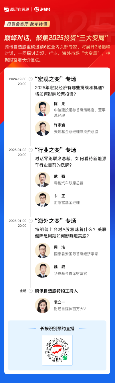 在这辞旧迎新之际,腾讯自选股联合泡财经出品的栏目《投资会客厅》,为辛苦了一年的投资者精心打造“2025投资大变局”跨年特辑,旨在以务实的投资视角,为大家揭示投资新趋势,探索新机会。