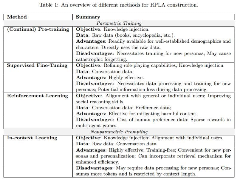 在技术实现层面,研究团队深入分析了RPLAs的构建方法。RPLAs通过人格数据来模拟复杂的人格,这些数据包括描述、画像、对话、历史行为记录以及书籍原文等文本材料。目前主要有两类构建方法:参数化训练和非参数化提示。
