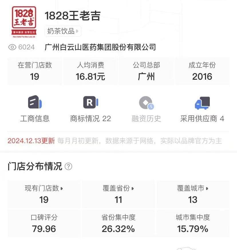 在国内凉茶市场没能获得突破的王老吉,近年来将目光放到了其他地方。1828王老吉是王老吉推出的线下茶饮品牌,主打现泡凉茶和草本新茶,刚开始也曾受到年轻人的追捧,但之后就被曝出加盟商亏损。到如今,市场上已经鲜少有1828王老吉的消息。窄门餐眼显示,截至12月13日,其在营门店数量仅剩下19家。